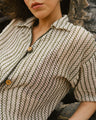 Introducing a crocheted shirt with details of loop buttons and delicate piping. This piece is crafted for resort settings and travel. With its thoughtful design and attention to detail, it offers a relaxed look that effortlessly will complement your leisurely escape.