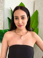 A minimal brass hasli necklace featuring a polished shell pendant with a natural spiral design.
